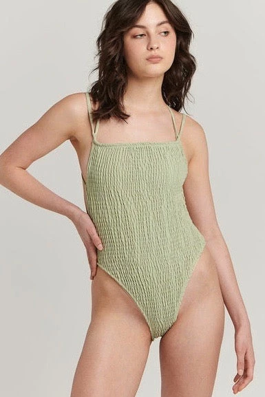 Delicate shirring in sage green gives this flattering one piece swimsuit timeless appeal. Team it with a longline shirt dress and oversized sunglasses on the sand.