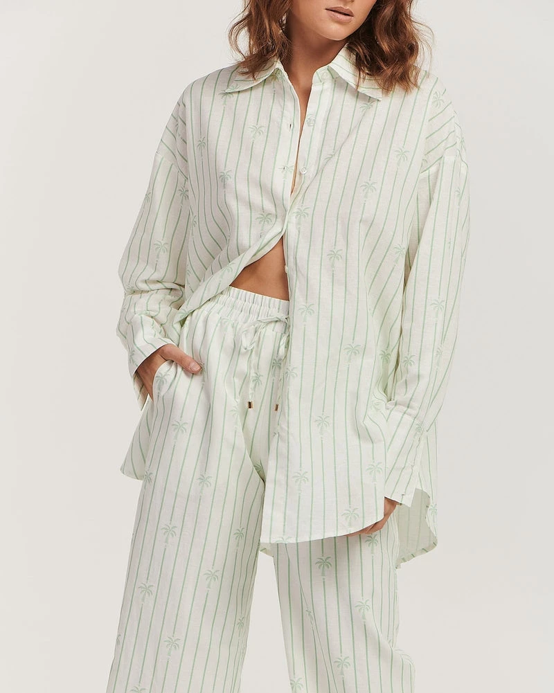 Made for resort living, this chic lounge shirt features a gorgeous pale green pinstripe. Pair it with some cute linen pants and heels for a date night out!
