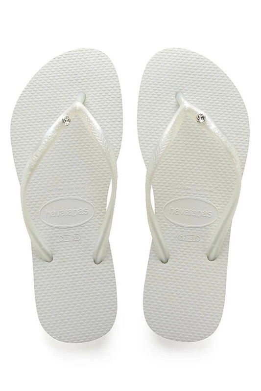 - Elevate your style with the Havaianas Women’s Slim Crystal Sandal in White. These chic flip-flops feature a slim, elegant design with crystal embellishments for a touch of sophistication.