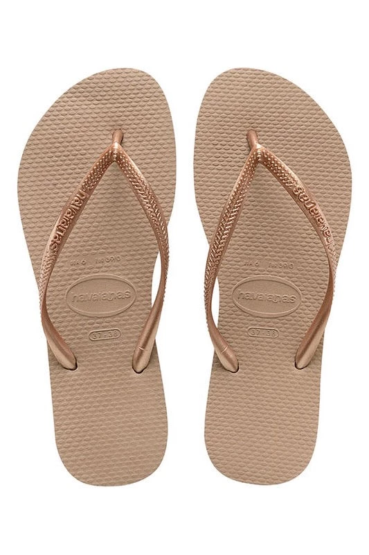- Elevate your style with the Havaianas Women’s Slim Sandal in Rose Gold. These chic flip-flops are designed for comfort and durability, making them perfect for everyday wear.