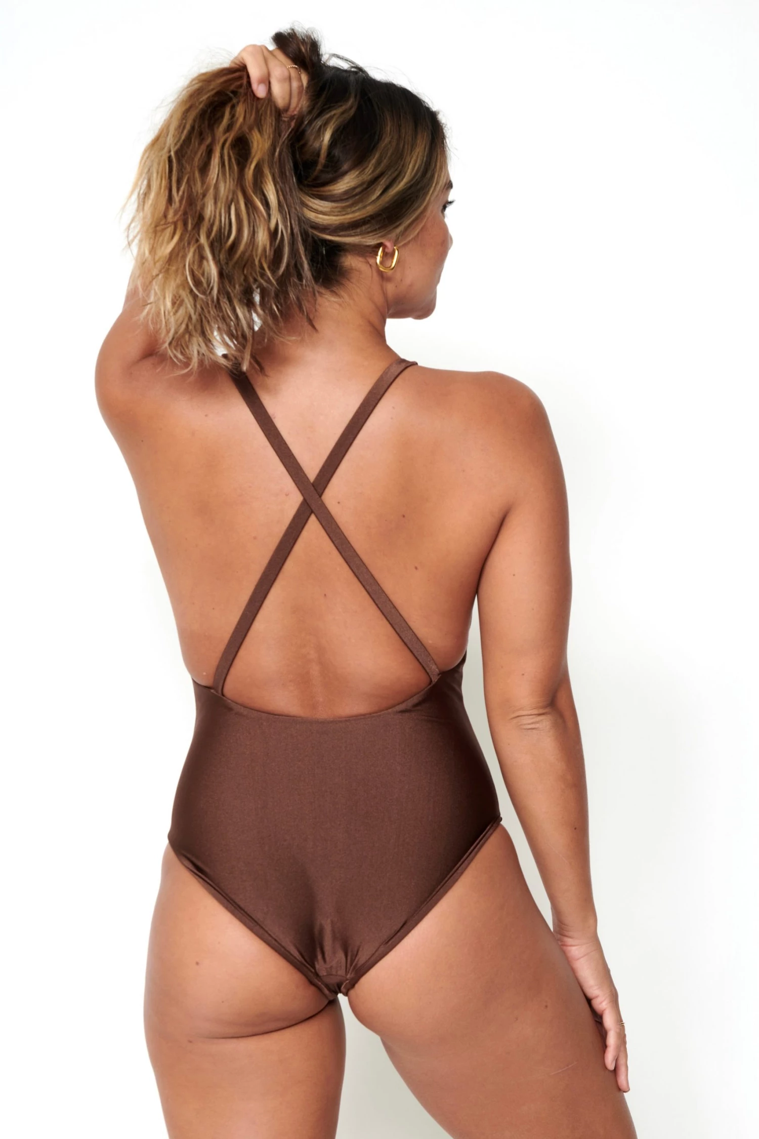 - Crafted with premium materials, the Mila One Piece offers a sleek, flattering fit with a subtle sheen that catches the light beautifully. The chocolate hue adds a touch of sophistication to your summer wardrobe.