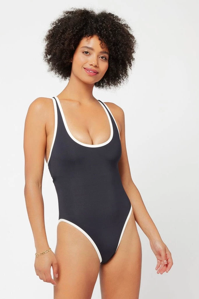 - Crafted by L*Space, a leading brand in premium swimwear, this one-piece features a sleek black and cream design that flatters all body types.