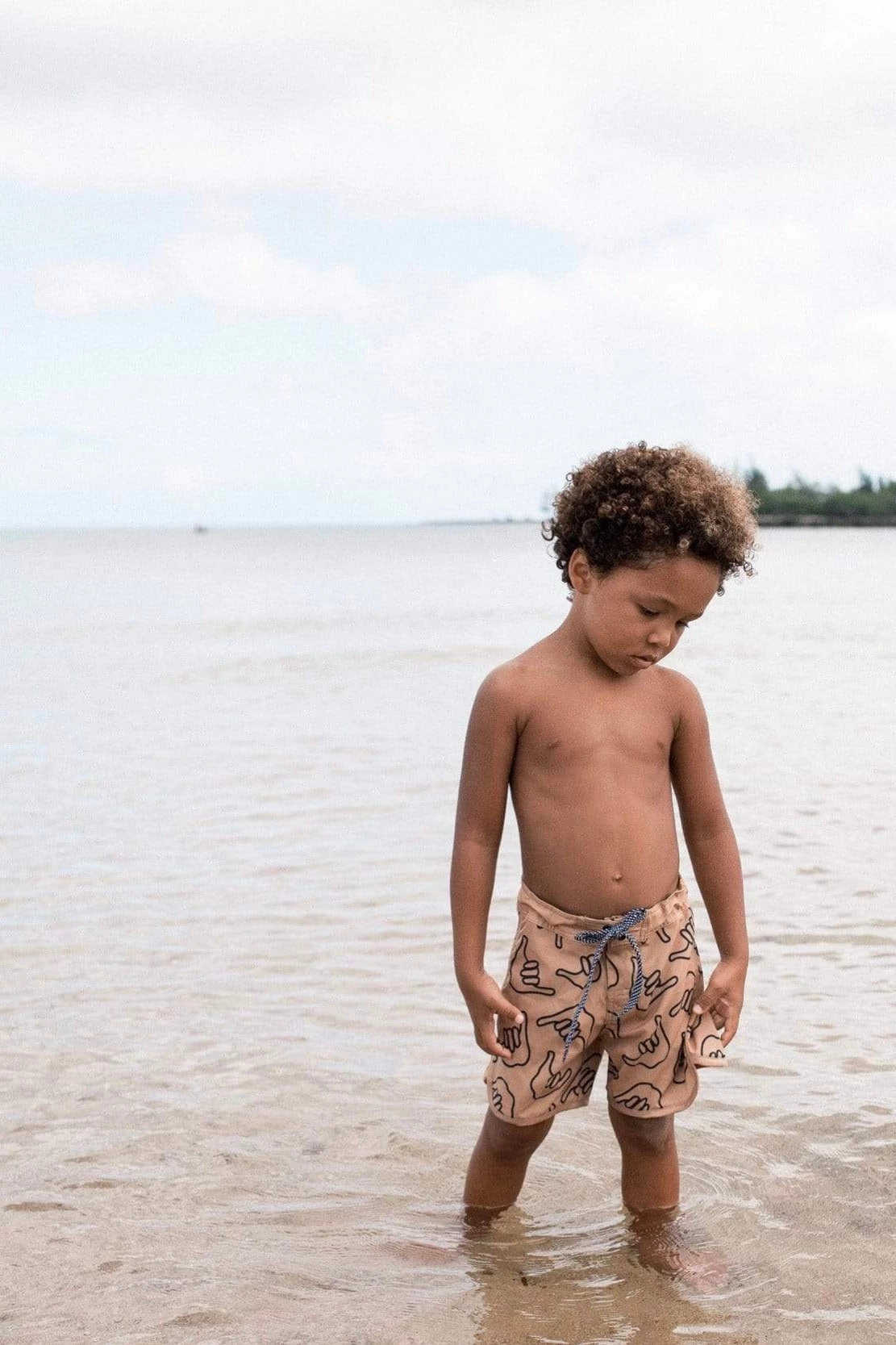 The Of One Sea Kid’s Retro Boardshorts in Tan Shaka feature a 4-way stretch technology board short that let your little man run and play in or out of the water! This performance fabric is lightweight, stretchy, soft to the touch and fast to dry. Of One Sea takes existing plastic rubbish, largely from discarded plastic water bottles, and breaks them down to create fine thread fibers that are then blended with a 4-way stretch swim farbic.