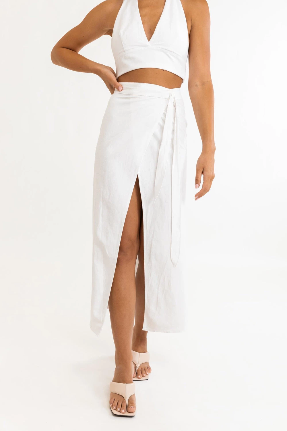 - Elevate your style with the Rhythm Rosa Wrap Skirt in White. This elegant wrap skirt features a flattering design, perfect for any occasion.